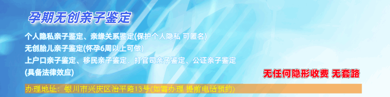 银川亲子鉴定上户口办理地址:银川市兴庆区治平路13号(如需办理,需提前预约)预约电话:4001789498,银川万核亲子鉴定中心的服务范围涵盖了广义的亲子鉴定、DNA验证、亲子鉴定证明等等。
